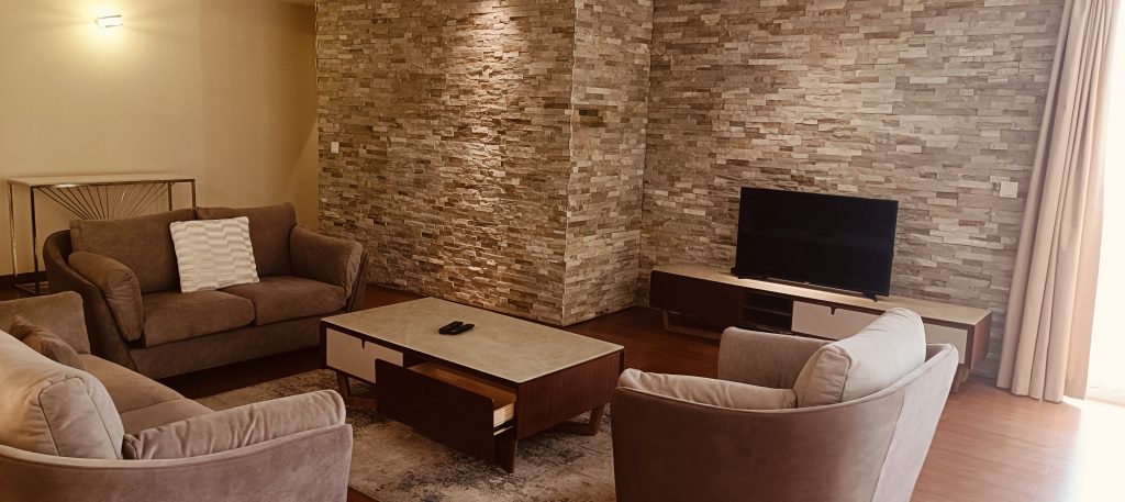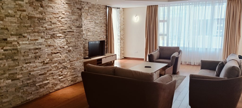 This a 2 bedroom furnished apartment in the heart of Kilimani. The apartments are fully serviced with a spacious living room, dining, modern kitchen with dhobi area. There is a guest cloakroom. The bedrooms have ample wardrobes and ensuite bathroom with a shower.